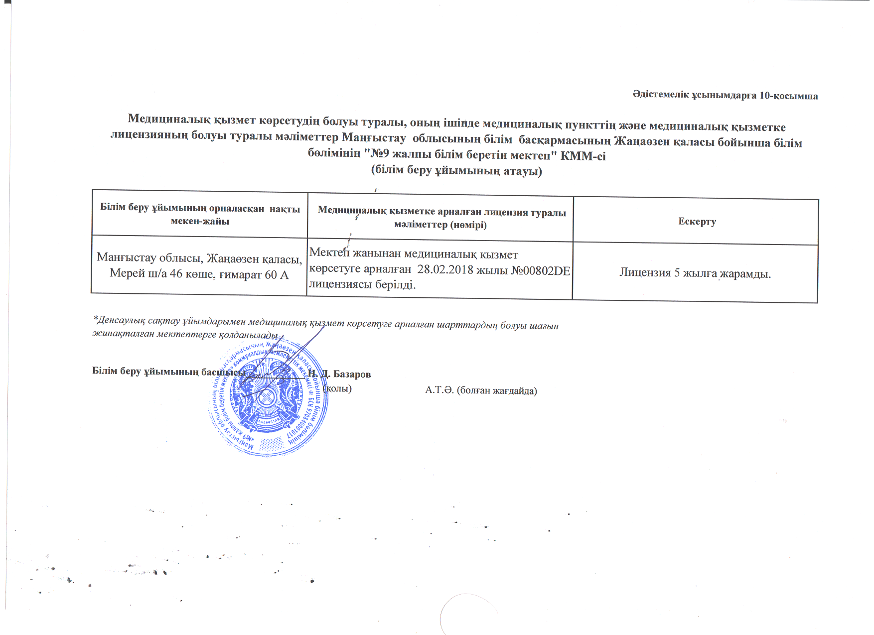 Маңғыстау облысының білім басқармасының Жаңаөзен қаласы бойынша білім бөлімінің «№9 жалпы білім беретін мектеп» коммуналдық мемлекеттік мекемесі.
